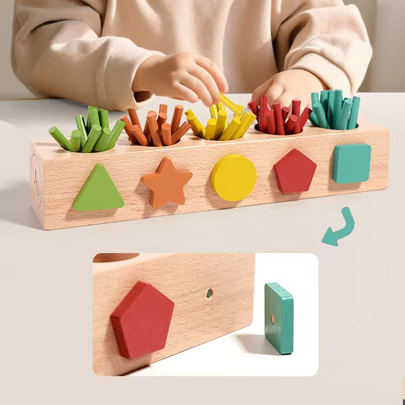 Picking up and placing the rods helps develop hand-eye coordination and dexterity in young hands.